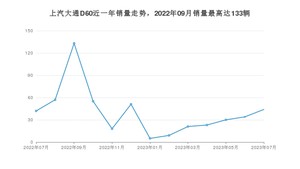 2023年7月,上汽大通D60销量为44辆,同比增长4.76%,环比增长29.41%。2022年07月-2023年07月份,上汽大通D60销量为522辆,同比下降39.09%。