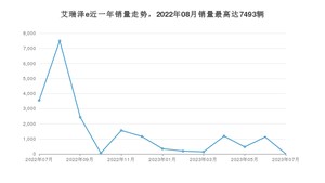 2023年7月,艾瑞泽e销量为7辆,同比下降99.8%,环比下降99.38%。2022年07月-2023年07月份,艾瑞泽e销量为19681辆,同比增长195.64%。