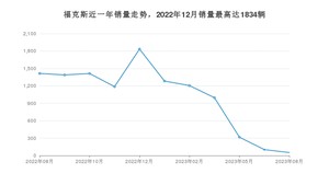 2023年8月,福克斯销量为52辆,同比下降96.32%,环比下降49.02%。2022年08月-2023年08月份,福克斯销量为11193辆,同比下降42.38%。