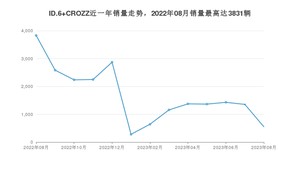 2023年8月,ID.6 CROZZ销量为551辆,同比下降85.62%,环比下降59.31%。2022年08月-2023年08月份,ID.6 CROZZ销量为21920辆,同比下降13.08%。
