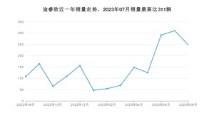 2023年8月,途睿欧销量为248辆,同比增长129.63%,环比下降20.26%。2022年08月-2023年08月份,途睿欧销量为1894辆,同比增长145.65%。