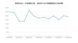 2023年8月,瑞虎5x销量为2367辆,同比下降20.97%,环比下降6.52%。2022年08月-2023年08月份,瑞虎5x销量为31383辆,同比下降34.2%。