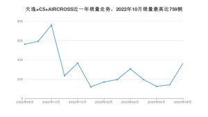 2023年8月,天逸 C5 AIRCROSS销量为364辆,同比下降35.23%,环比增长158.16%。2022年08月-2023年08月份,天逸 C5 AIRCROSS销量为4131辆,同比下降55.53%。