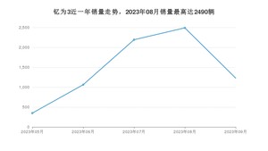 2023年9月,钇为3销量为1227辆,环比下降50.72%。2022年09月-2023年09月份,钇为3销量为7317辆,