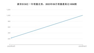 2023年9月,蔚来EC6销量为1006辆,环比增长341.23%。2022年09月-2023年09月份,蔚来EC6销量为1234辆,
