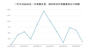 2023年9月,一汽丰田bZ4X销量为123辆,环比下降83.4%。2022年09月-2023年09月份,一汽丰田bZ4X销量为7949辆,
