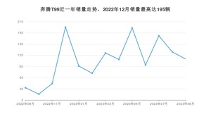 2023年9月,奔腾T99销量为110辆,同比增长233.33%,环比下降14.73%。2022年09月-2023年09月份,奔腾T99销量为1384辆,同比下降61.06%。