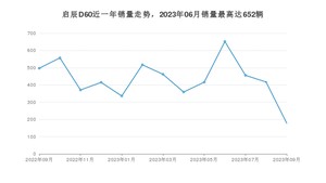 2023年9月,启辰D60销量为178辆,同比下降64.19%,环比下降57.31%。2022年09月-2023年09月份,启辰D60销量为5633辆,同比下降67.75%。