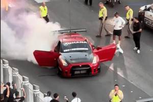 两辆车中第一辆起火的是一辆红色GT-R,挡风玻璃上有Rohana Wheels标志。抖音用户@minnoxide拍摄到了这辆日产汽车的视频,它成功地立即停车,在汽车后部开始喷出烟雾时,乘客已经下车逃离。司机立刻从附近的警察那里借了一个小灭火器来处理火势。