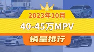2023年10月的乘用车销量数据已经出炉,据众车网汽车行业数据监测显示,10月国内乘用车市场销量达到178.74万辆,同比下降1.03%,环比下降0.36%。每月各个细分市场的销量排行榜,也成为了大家所关注的话题,今天众车网为大家带来了,2023年10月40-45万MPV的销量排行榜单,有哪些车型能跻身销量榜呢?下面我们直接看数据。