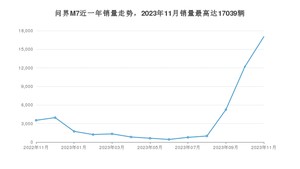 2023年11月,问界M7销量为17039辆,同比增长382.83%,环比增长39.74%。2022年11月-2023年11月份,问界M7销量为49902辆,同比增长188.97%。