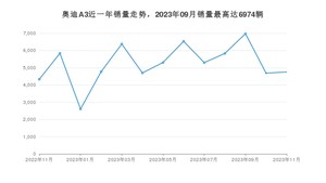 2023年11月,奥迪A3销量为4754辆,同比增长9.79%,环比增长1.47%。2022年11月-2023年11月份,奥迪A3销量为67991辆,同比下降2.48%。