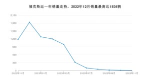 2023年11月,福克斯销量为8辆,同比下降99.33%,环比下降46.67%。2022年11月-2023年11月份,福克斯销量为7024辆,同比下降57.27%。