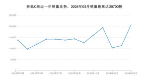 2024年3月,奔驰C级销量为20700辆,同比增长50.07%,环比增长83.14%。2023年03月-2024年03月份,奔驰C级销量为182298辆,同比增长15.07%。