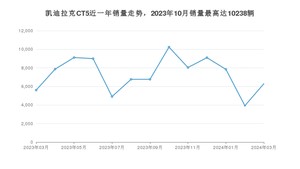 2024年3月,凯迪拉克CT5销量为6292辆,同比增长12.3%,环比增长60.47%。2023年03月-2024年03月份,凯迪拉克CT5销量为95441辆,同比增长38.56%。