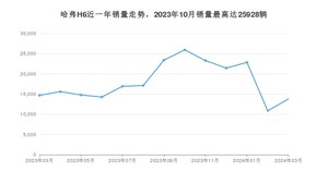 2024年3月,哈弗H6销量为13811辆,同比下降6.09%,环比增长27.31%。2023年03月-2024年03月份,哈弗H6销量为234984辆,同比增长0.79%。