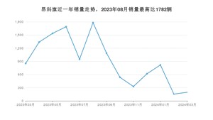 2024年3月,昂科旗销量为197辆,同比下降76.93%,环比增长27.1%。2023年03月-2024年03月份,昂科旗销量为11889辆,同比下降41.21%。