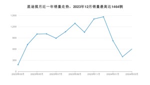 2024年3月,星途揽月销量为602辆,同比增长230.77%,环比增长53.57%。2023年03月-2024年03月份,星途揽月销量为11893辆,同比增长2%。