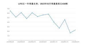2024年3月,LIFE销量为234辆,同比下降64%,环比增长40.96%。2023年03月-2024年03月份,LIFE销量为6074辆,同比下降53.6%。