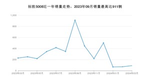 2024年3月,标致5008销量为90辆,同比下降60.53%,环比增长28.57%。2023年03月-2024年03月份,标致5008销量为4104辆,同比下降2.89%。