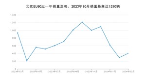2024年3月,北京BJ60销量为408辆,同比下降56.27%,环比增长39.25%。2023年03月-2024年03月份,北京BJ60销量为9172辆,同比增长264.4%。
