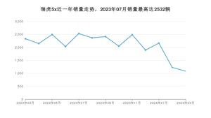 2024年3月,瑞虎5x销量为1082辆,同比下降53.6%,环比下降11.75%。2023年03月-2024年03月份,瑞虎5x销量为27231辆,同比下降13.52%。