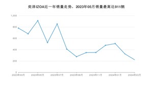2024年3月,奕泽IZOA销量为222辆,同比下降71.54%,环比下降31.69%。2023年03月-2024年03月份,奕泽IZOA销量为6663辆,同比下降63.76%。