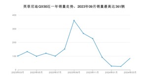 2024年3月,英菲尼迪QX50销量为85辆,同比下降15.84%,环比增长254.17%。2023年03月-2024年03月份,英菲尼迪QX50销量为1789辆,同比下降38.67%。