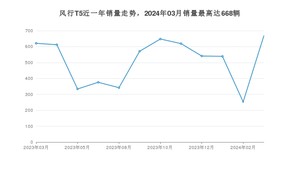 2024年3月,风行T5销量为668辆,同比增长7.57%,环比增长164.03%。2023年03月-2024年03月份,风行T5销量为6124辆,同比增长20.91%。