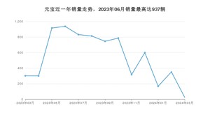 2024年3月,元宝销量为24辆,同比下降92.03%,环比下降93.18%。2023年03月-2024年03月份,元宝销量为7087辆,同比下降25.68%。