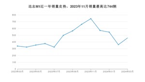 2024年3月,远志M1销量为459辆,同比增长35.4%,环比增长27.86%。2023年03月-2024年03月份,远志M1销量为6115辆,同比增长129.71%。
