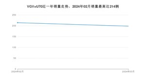 2024年3月,VGV U70销量为198辆,环比下降7.48%。2023年03月-2024年03月份,VGV U70销量为412辆,同比下降85.89%。