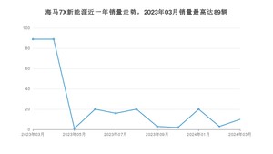 2024年3月,海马7X新能源销量为10辆,同比下降88.76%,环比增长233.33%。2023年03月-2024年03月份,海马7X新能源销量为273辆,同比增长40%。
