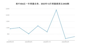 2024年3月,枫叶60s销量为299辆,同比下降67.36%,环比增长112.06%。2023年03月-2024年03月份,枫叶60s销量为7100辆,同比下降63.54%。