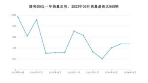 2024年5月,腾势D9销量为473辆,同比下降51.14%,环比下降0.21%。2023年05月-2024年05月份,腾势D9销量为6648辆,同比增长105.44%。
