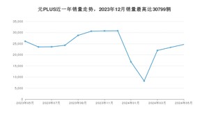 2024年5月,元PLUS销量为24646辆,同比下降5.47%,环比增长5.65%。2023年05月-2024年05月份,元PLUS销量为313341辆,同比增长21.38%。