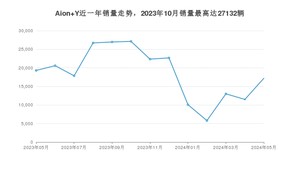 2024年5月,Aion Y销量为17190辆,同比下降10.96%,环比增长49.47%。2023年05月-2024年05月份,Aion Y销量为241168辆,同比增长44.45%。