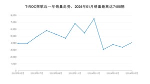 2024年5月,T-ROC探歌销量为4061辆,同比增长2.73%,环比增长20.33%。2023年05月-2024年05月份,T-ROC探歌销量为62589辆,同比下降26.84%。
