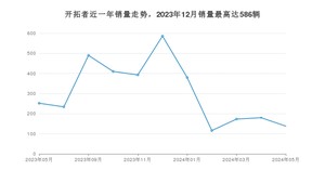 2024年5月,开拓者销量为138辆,同比下降45.24%,环比下降23.33%。2023年05月-2024年05月份,开拓者销量为3352辆,同比增长19.59%。