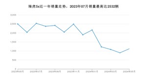 2024年5月,瑞虎5x销量为1121辆,同比下降55.09%,环比增长25.11%。2023年05月-2024年05月份,瑞虎5x销量为24766辆,同比下降23.71%。