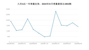 2024年5月,几何A销量为1385辆,同比下降26.87%,环比下降21.13%。2023年05月-2024年05月份,几何A销量为18107辆,同比下降66.37%。