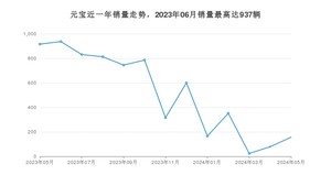 2024年5月,元宝销量为157辆,同比下降82.86%,环比增长98.73%。2023年05月-2024年05月份,元宝销量为6722辆,同比下降37.48%。