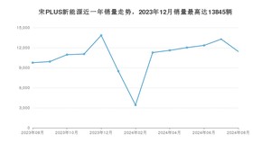 2024年8月,宋PLUS新能源销量为11419辆,同比增长17.12%,环比下降14.02%。2023年08月-2024年08月份,宋PLUS新能源销量为139318辆,同比下降67.63%。