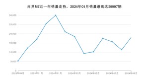 2024年9月,问界M7销量为17940辆,同比增长241.84%,环比增长59.25%。2023年09月-2024年09月份,问界M7销量为211403辆,同比增长589.91%。