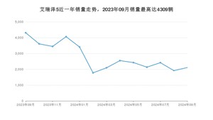 2024年9月,艾瑞泽5销量为2109辆,同比下降51.06%,环比增长10.13%。2023年09月-2024年09月份,艾瑞泽5销量为36245辆,同比下降29.99%。