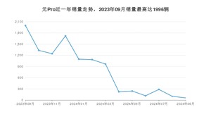 2024年9月,元Pro销量为58辆,同比下降97.09%,环比下降42.57%。2023年09月-2024年09月份,元Pro销量为10451辆,同比增长46.48%。