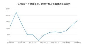2024年9月,钇为3销量为1596辆,同比增长30.07%,环比增长31.79%。2023年09月-2024年09月份,钇为3销量为12041辆,同比增长64.56%。