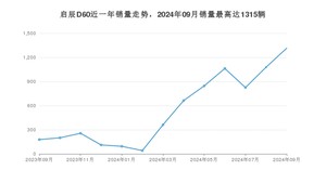 2024年9月,启辰D60销量为1315辆,同比增长638.76%,环比增长21.99%。2023年09月-2024年09月份,启辰D60销量为7031辆,同比增长24.82%。