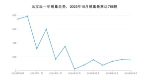 2024年9月,元宝销量为154辆,同比下降79.33%,环比下降4.35%。2023年09月-2024年09月份,元宝销量为3753辆,同比下降73.34%。
