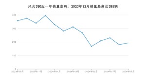 2024年9月,风光380销量为193辆,同比下降45.94%,环比增长7.22%。2023年09月-2024年09月份,风光380销量为3633辆,同比增长23.19%。